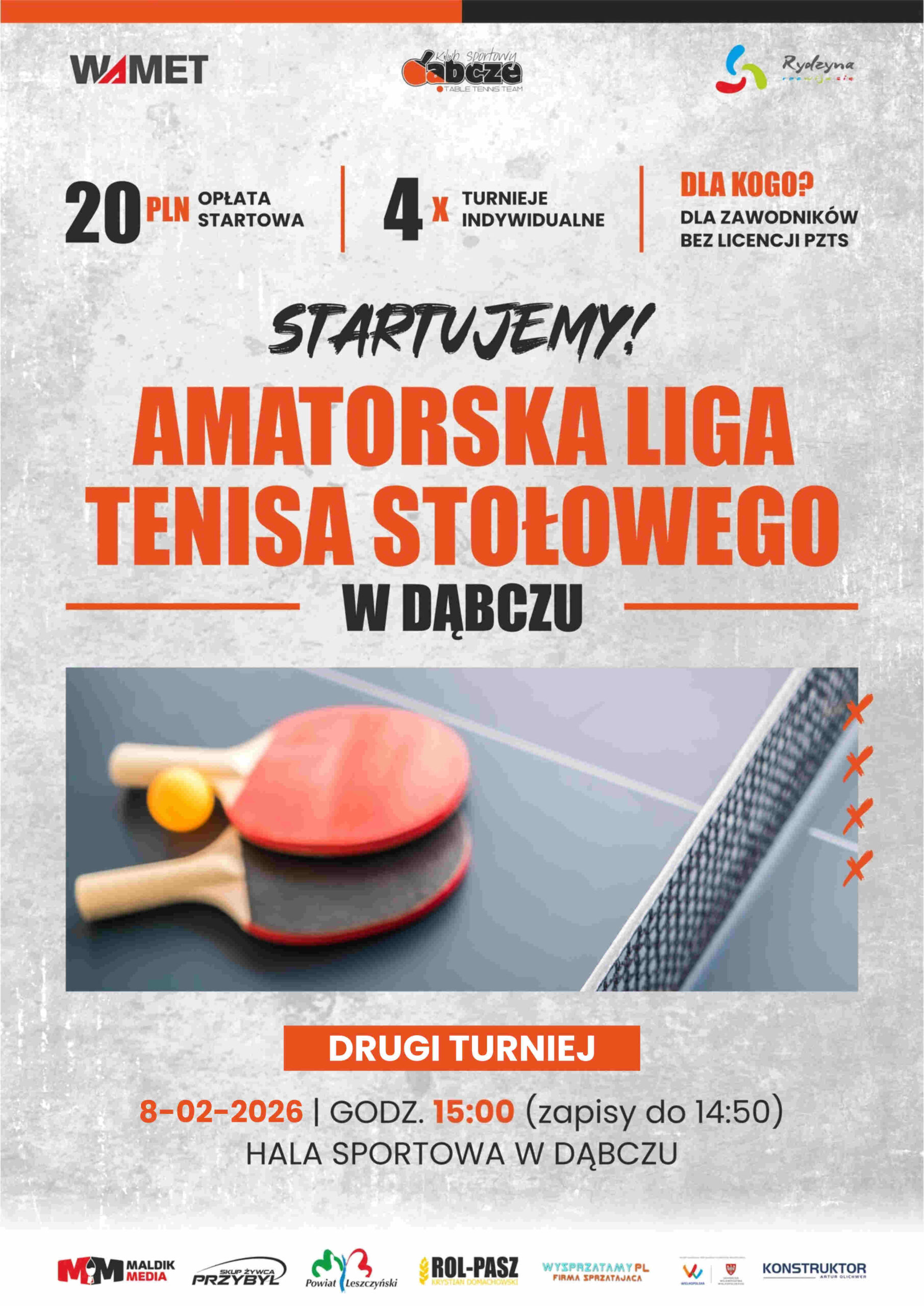 Klub Sportowy Wamet Dąbcze zaprasza do udziału w drugim indywidualnym turnieju Amatorskiej Ligi Tenisa Stołowego w Dąbczu. Zawody odbędą się w niedzielę, 8 lutego 2026 roku, na hali sportowej w Dąbczu.