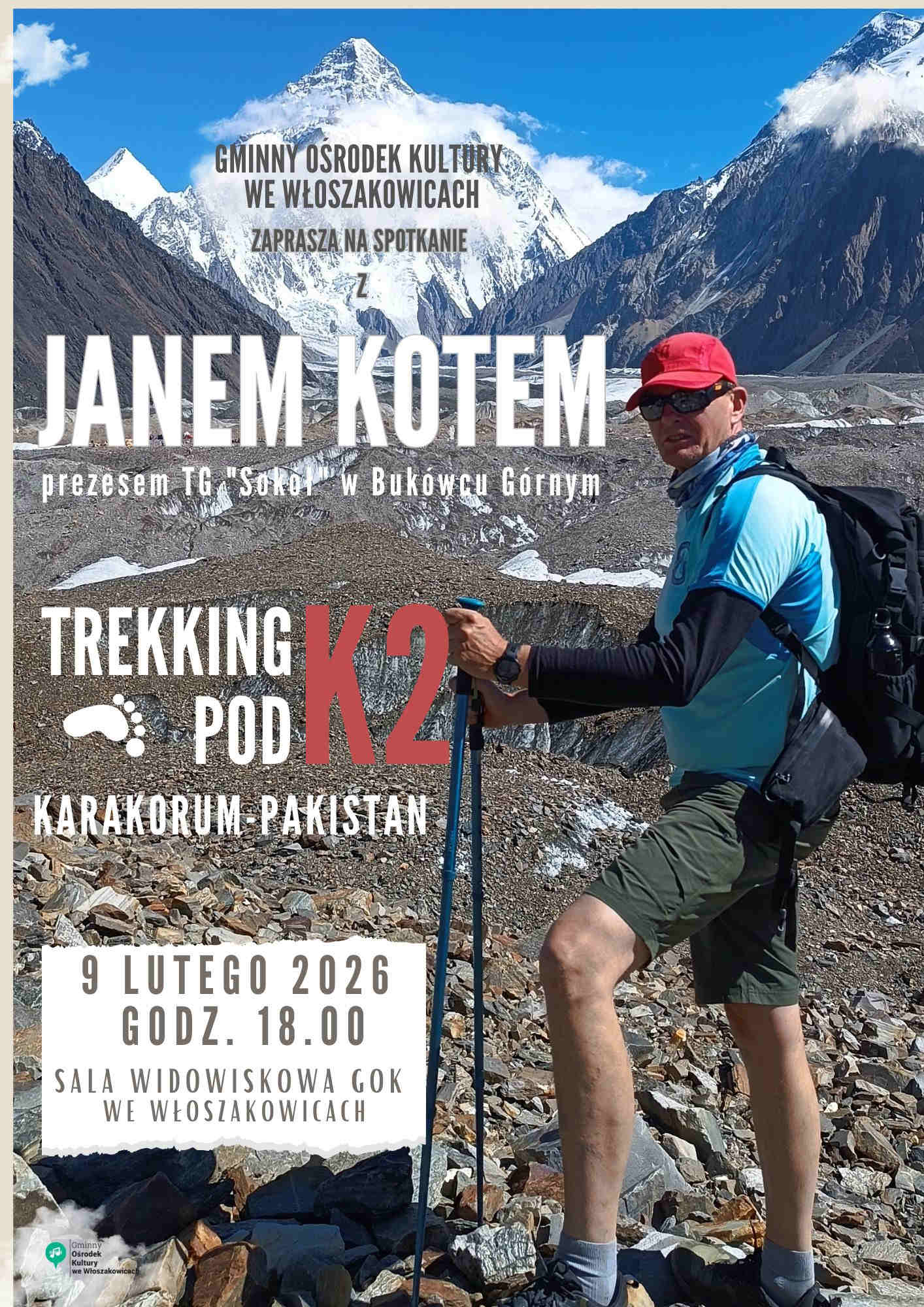 Gminny Ośrodek Kultury we Włoszakowicach zaprasza na wyjątkowe spotkanie podróżnicze poświęcone jednej z najbardziej surowych i fascynujących krain świata. W poniedziałek 9 lutego 2026 roku o godzinie 18:00 w sali widowiskowej GOK odbędzie się prelekcja „Trekking pod K2”, której gościem będzie Jan Kot. Wstęp na wydarzenie jest wolny.