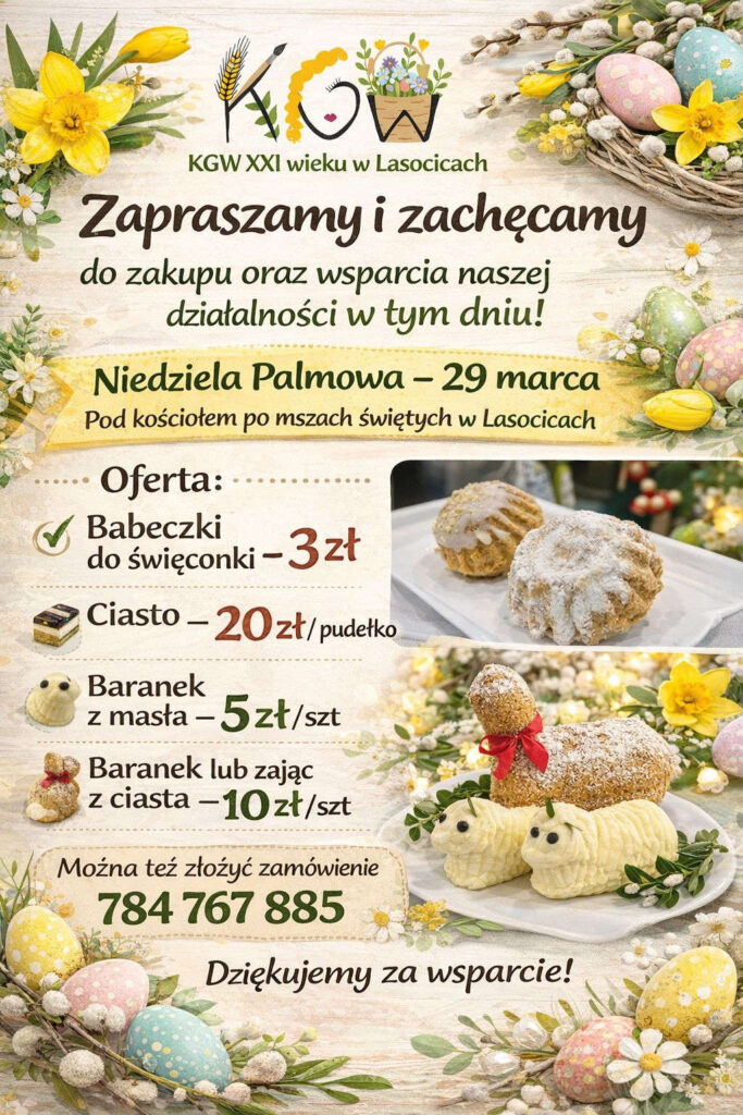 Koło Gospodyń Wiejskich XXI wieku w Lasocicach zaprasza mieszkańców do wsparcia swojej działalności podczas Niedzieli Palmowej. 🌿