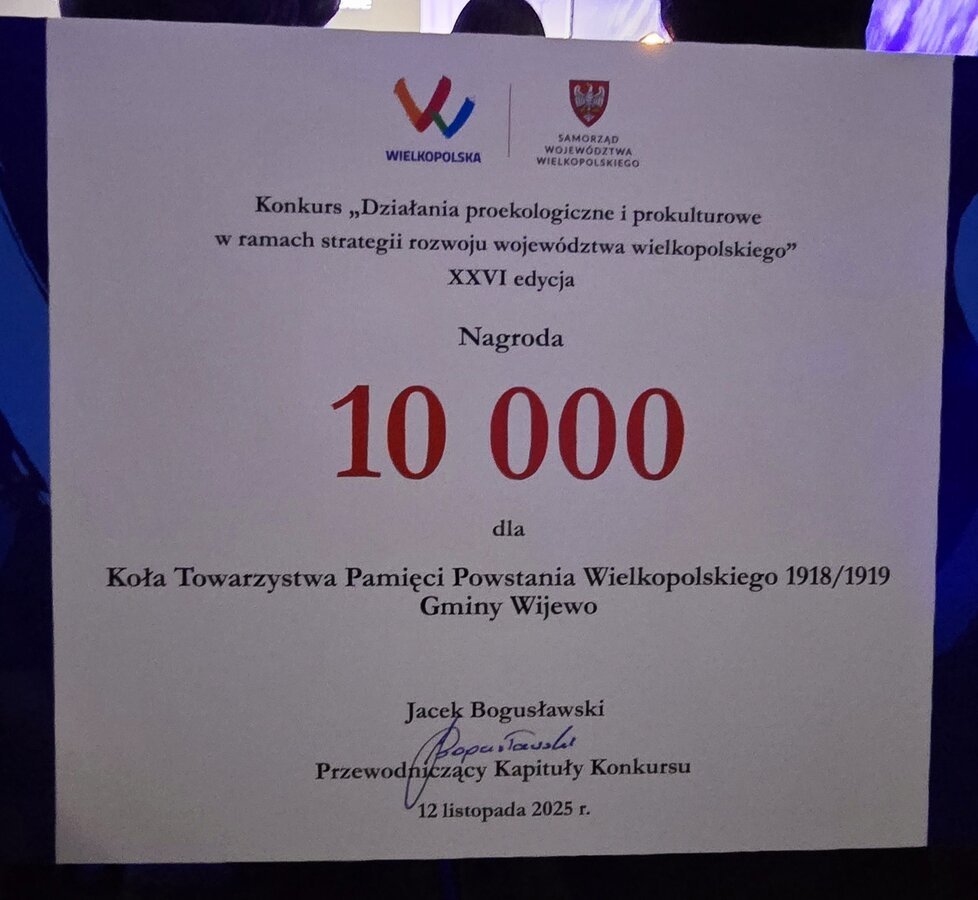 Koło Towarzystwa Pamięci Powstania Wielkopolskiego 1918/1919 Gminy Wijewo działa zaledwie od roku, a już może pochwalić się pierwszym znaczącym osiągnięciem. 12 listopada br. inicjatywa Koła została doceniona podczas XXVI Gali konkursu Samorządu Województwa Wielkopolskiego „Działania proekologiczne i prokulturowe w ramach strategii rozwoju województwa wielkopolskiego”.