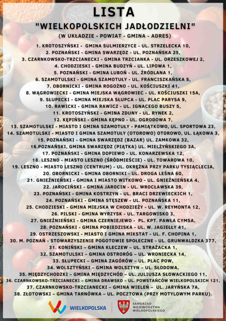 Idea dzielenia się żywnością pełni ważną rolę w lokalnych społecznościach i wspólnotach, zwłaszcza w okresie świątecznym. Warto nie być obojętnym na trudny los innych osób. „Wielkopolskie Jadłodzielnie” to miejsca, w których mieszkańcy w sposób dobrowolny, anonimowy i bezinteresowny mogą wymieniać się z innymi wytworzoną żywnością i produktami nadającymi się do spożycia. Każdy punkt wymiany wyposażony jest w witrynę lub ladę na produkty wymagające ciągu chłodniczego, regał na warzywa, owoce czy opakowane produkty sypkie, jak kasza, makaron czy mąka. Zasady korzystania z jadłodzielni są proste i wyraźnie opisane na plakatach. Informują one, jakie produkty można przynieść, a jakich nie wolno tam wkładać. Od początku realizacji programu Samorząd Województwa Wielkopolskiego przeznaczył ponad 800 tys. złotych na dofinansowanie utworzenia punktów dzielenia się żywnością.