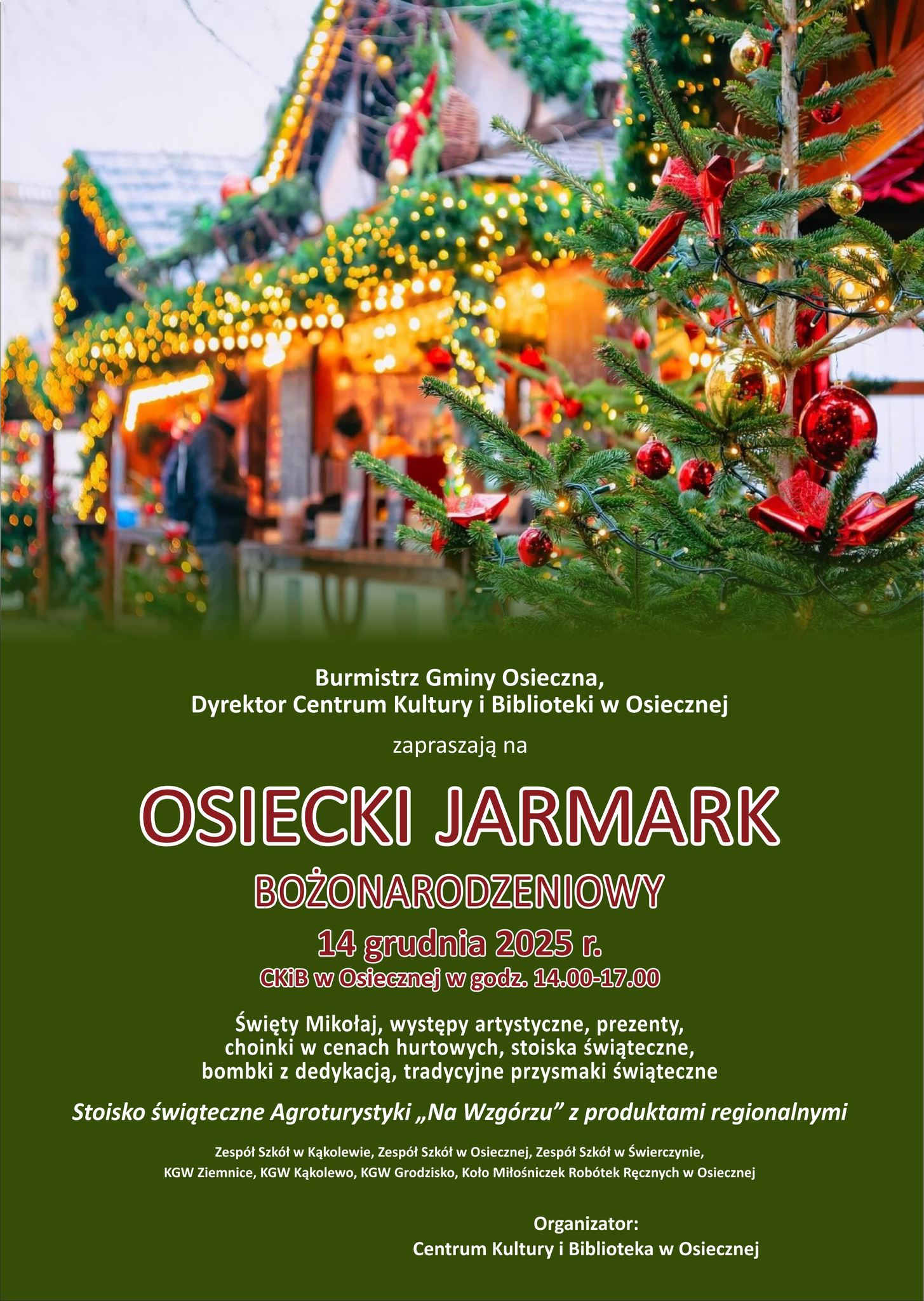 Centrum Kultury i Biblioteka w Osiecznej wraz z Burmistrzem Gminy Osieczna zapraszają mieszkańców oraz gości na Osiecki Jarmark Bożonarodzeniowy, który odbędzie się 14 grudnia 2025 roku w godzinach 14:00–17:00 w siedzibie CKiB w Osiecznej. To wydarzenie, które na stałe wpisało się w przedświąteczny kalendarz gminy, w tym roku ponownie zaoferuje bogaty program i wyjątkową atmosferę.