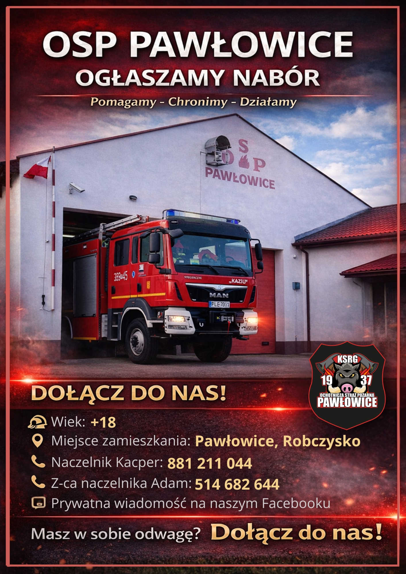 Osoby zainteresowane wstąpieniem w szeregi OSP Pawłowice mogą skontaktować się bezpośrednio z przedstawicielami jednostki: