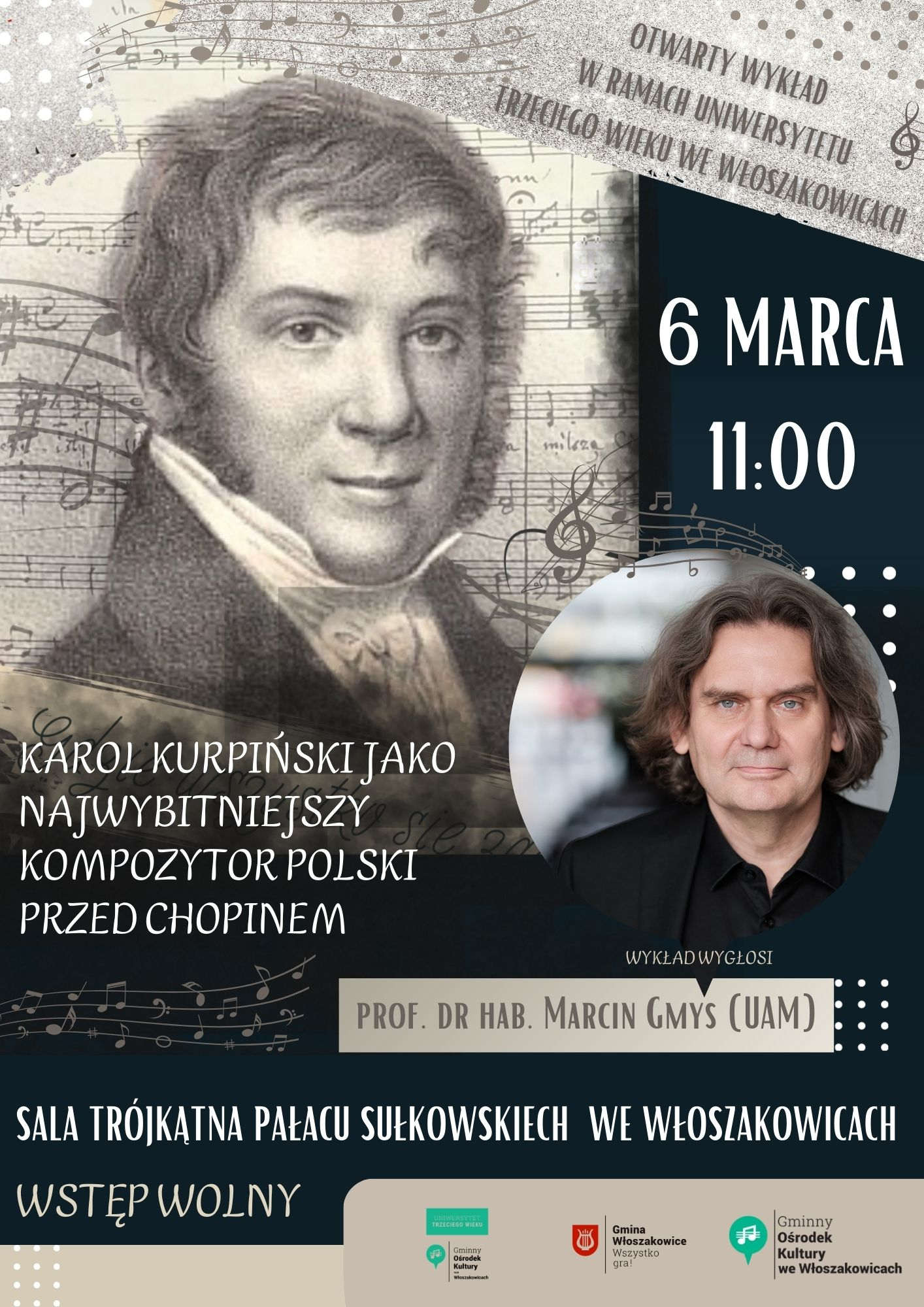 Gminny Ośrodek Kultury we Włoszakowicach zaprasza na otwarty wykład wybitnego muzykologa, prof. dr. hab. Marcina Gmysa z Uniwersytetu im. Adama Mickiewicza w Poznaniu. Spotkanie zatytułowane „Karol Kurpiński jako najwybitniejszy kompozytor polski przed Chopinem” odbędzie się 6 marca o godz. 11.00 w Sali Trójkątnej Pałacu Sułkowskich we Włoszakowicach. Wstęp na wydarzenie jest wolny.