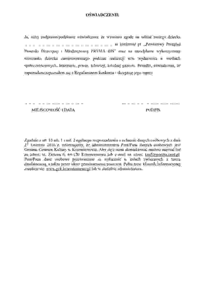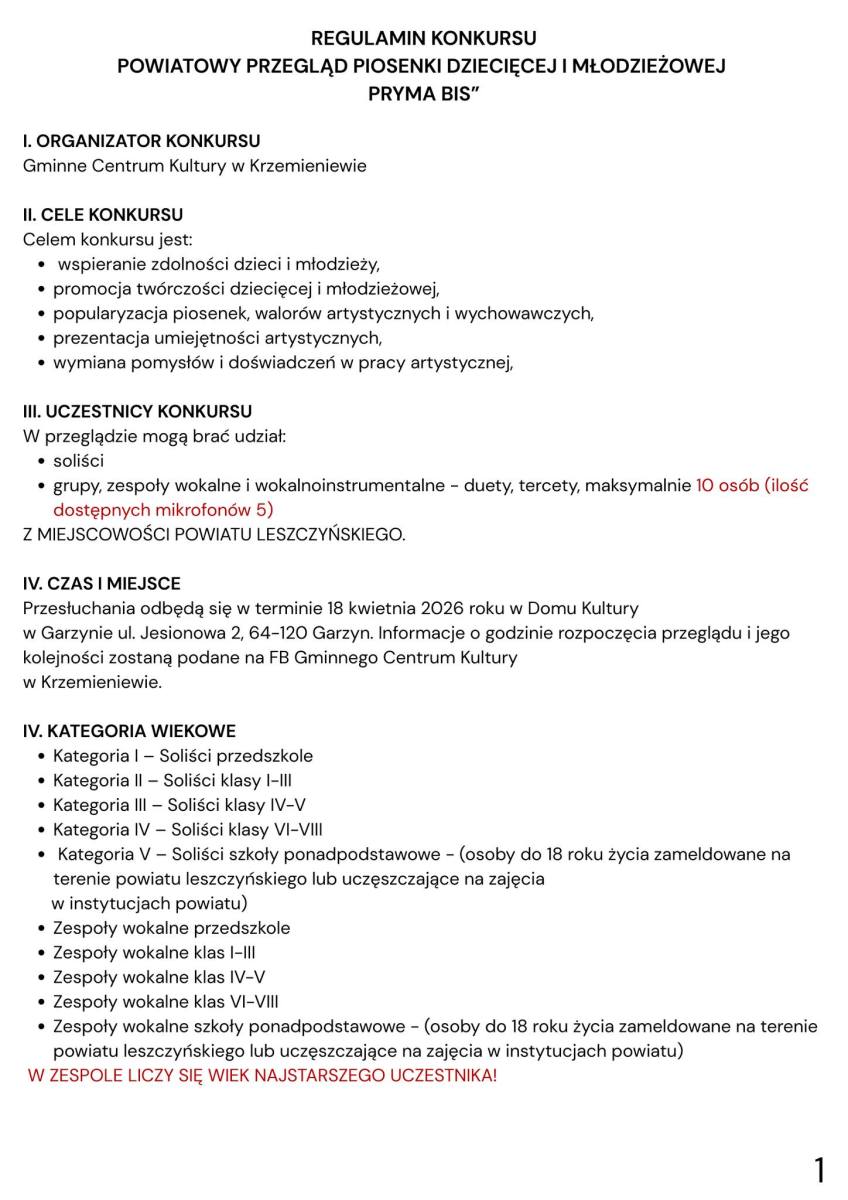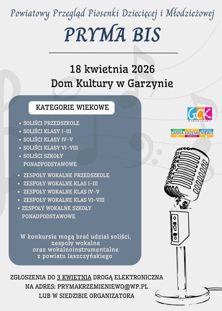 Gminne Centrum Kultury w Krzemieniewie ogłosiło rozpoczęcie zapisów do Powiatowego Przeglądu Piosenki Dziecięcej i Młodzieżowej „PRYMA BIS”. Wydarzenie skierowane jest do młodych wokalistów z powiatu leszczyńskiego.