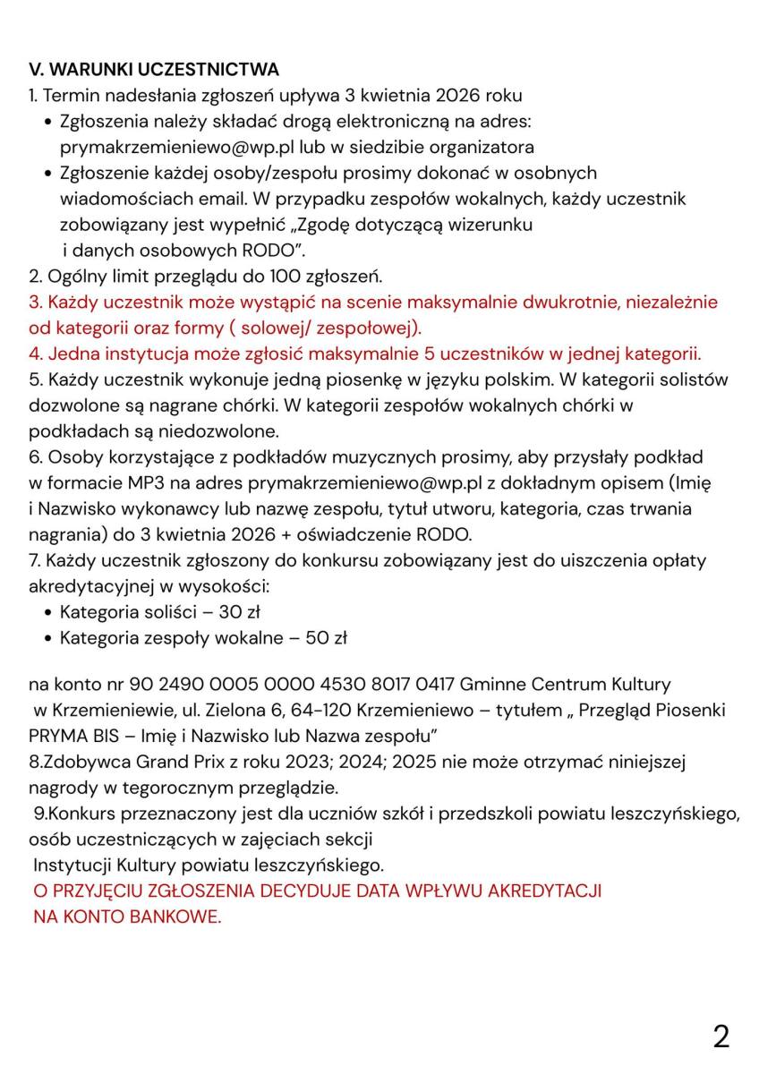 W konkursie mogą wziąć udział soliści, zespoły wokalne oraz wokalno-instrumentalne reprezentujące przedszkola, szkoły podstawowe i ponadpodstawowe oraz instytucje kultury z regionu.