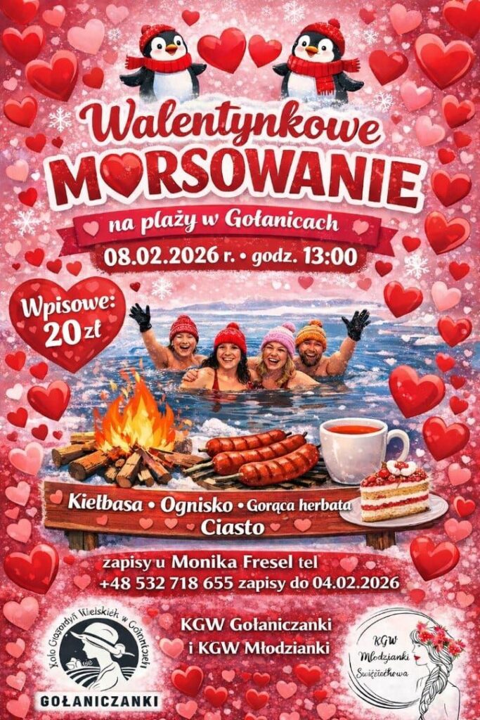 Uczestnicy proszeni są o zabranie ze sobą dobrego humoru, ciepłych ubrań na przebranie po kąpieli oraz chęci do wspólnej zabawy. Walentynkowe morsowanie w Gołanicach to propozycja dla wszystkich, którzy lubią aktywność, integrację i nietypowe formy świętowania zimy – niezależnie od wieku i doświadczenia.