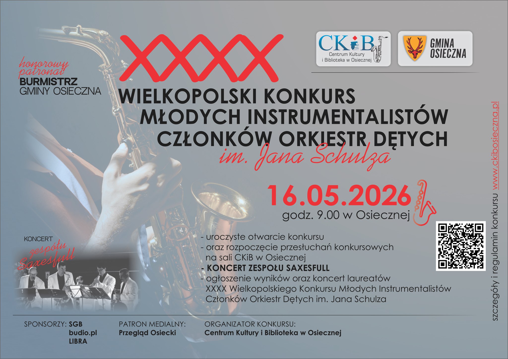 16 maja 2026 roku w Osiecznej odbędzie się XXXV Wielkopolski Konkurs Młodych Instrumentalistów Członków Orkiestr Dętych im. Jana Schulza. Wydarzenie rozpocznie się o godzinie 9.00 w Centrum Kultury i Bibliotece w Osiecznej.
