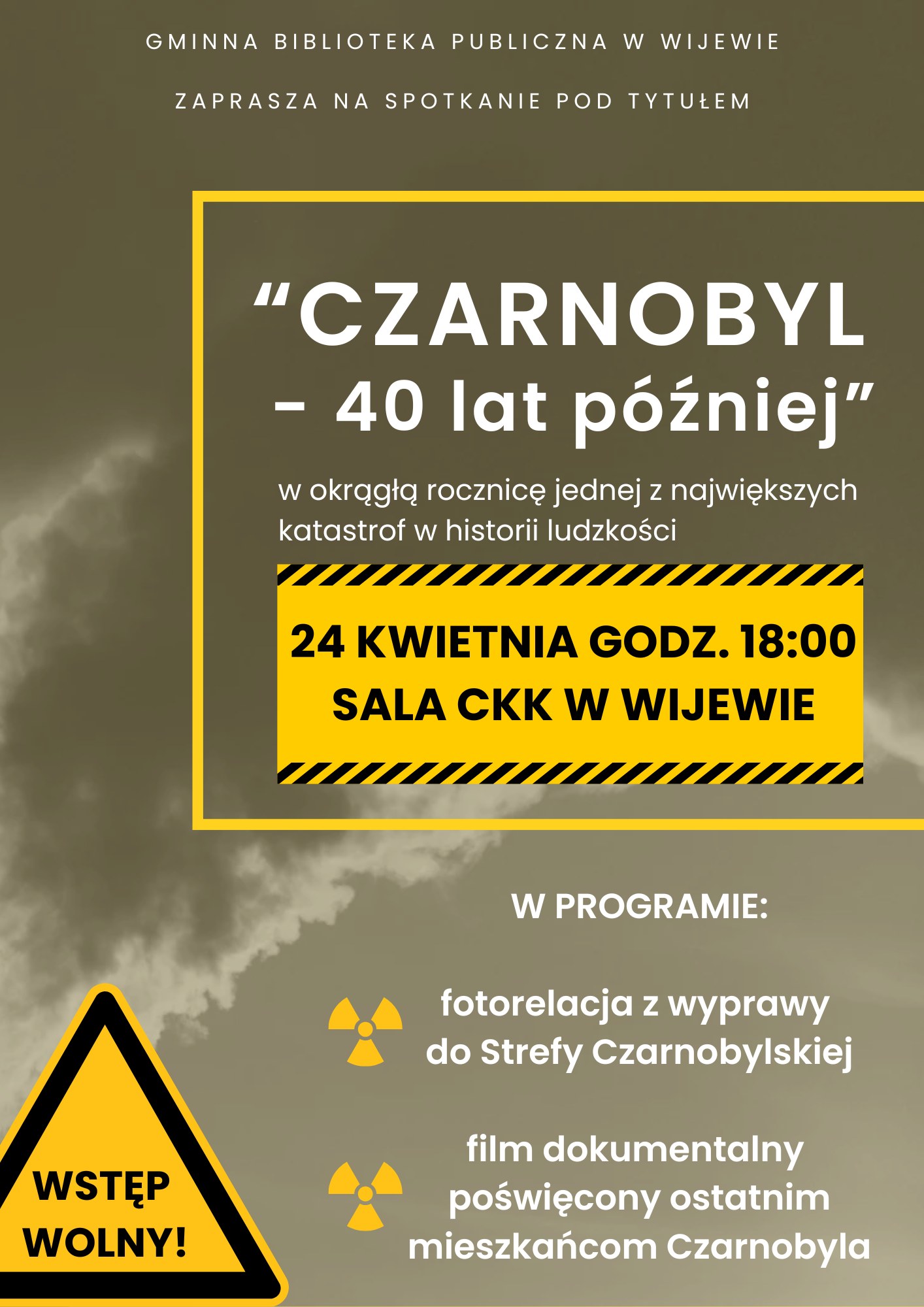 Gminna Biblioteka Publiczna w Wijewie zaprasza mieszkańców na wydarzenie pt. „Czarnobyl – 40 lat później”, organizowane w rocznicę jednej z największych katastrof w historii ludzkości.