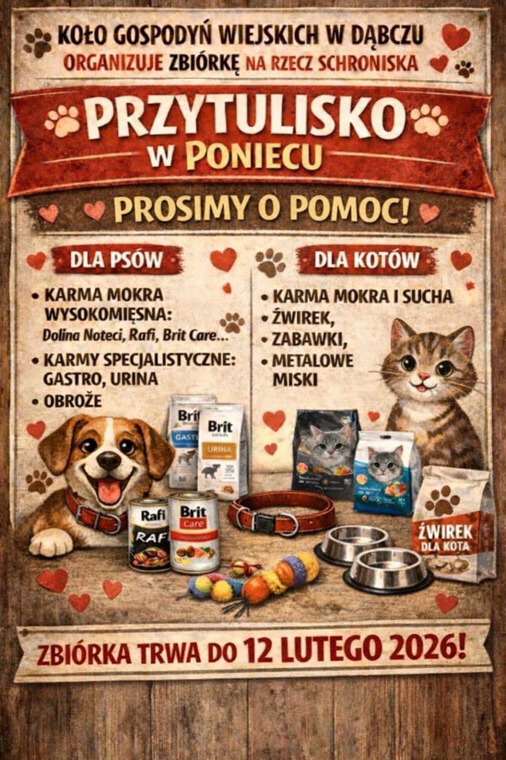 Koło Gospodyń Wiejskich w Dąbczu ogłasza zbiórkę darów na rzecz Przytulisko dla zwierząt w Poniecu. Akcja skierowana jest do wszystkich mieszkańców, którzy chcą realnie pomóc czworonożnym podopiecznym placówki – każda, nawet najmniejsza forma wsparcia, ma ogromne znaczenie.