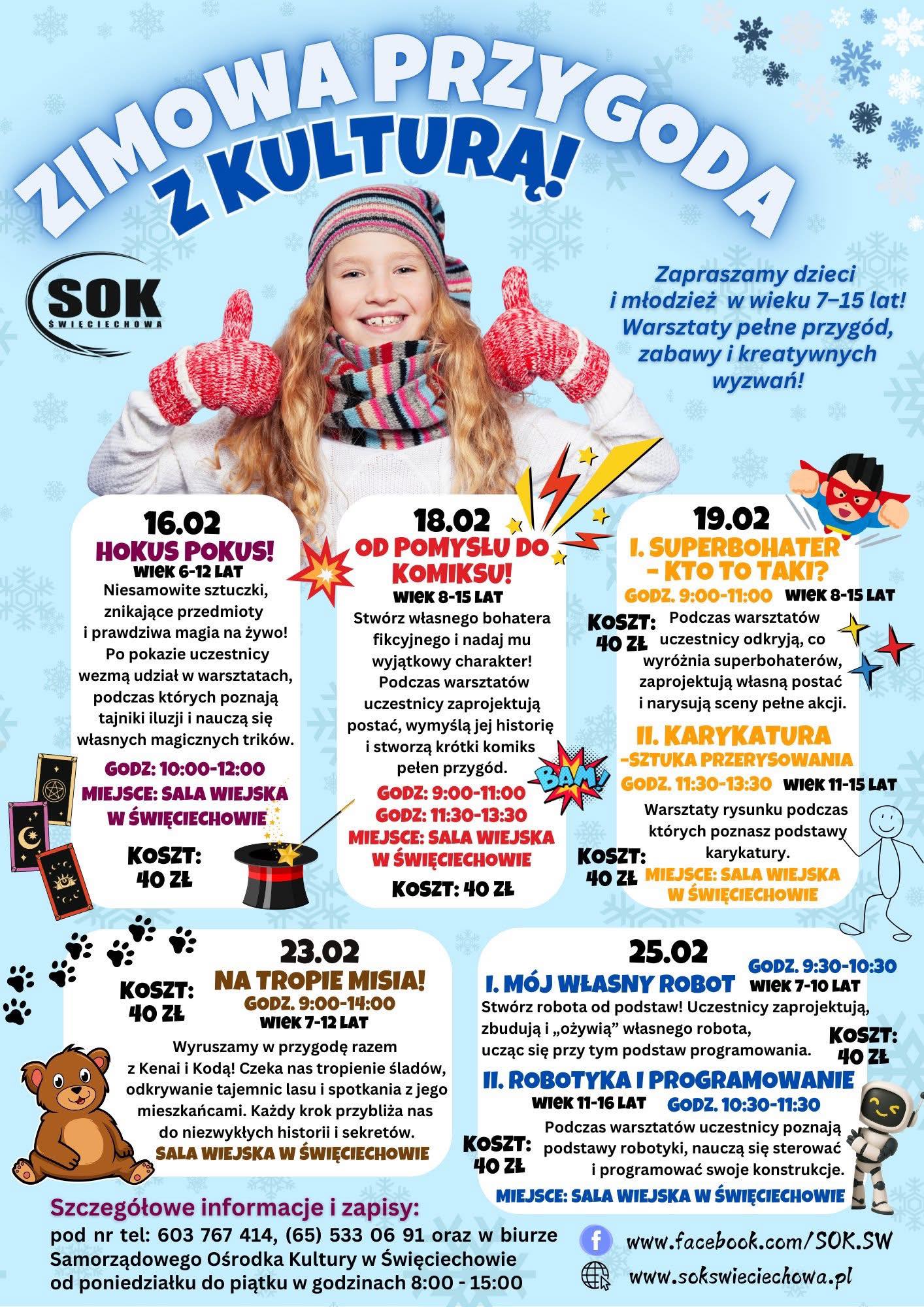 Samorządowy Ośrodek Kultury w Święciechowa przygotował dla najmłodszych mieszkańców bogatą i różnorodną ofertę ferii zimowych pod hasłem „Zimowa przygoda z kulturą!”. Propozycja skierowana jest do dzieci i młodzieży w wieku od 7 do 15 lat i obejmuje cykl warsztatów łączących zabawę, kreatywność oraz edukację.